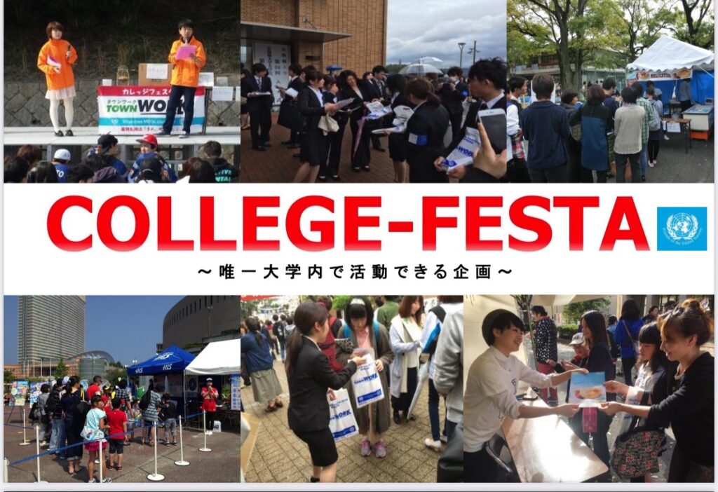 「カレッジフェスタ」とは、学生達が学校の壁を取っ払っい協力し合って一緒にできるイベントを作れないかで「カレッジフェスタ」を立ち上げました。大学、短大、専門学校の学校の学祭実行委員会(学生達)が学園祭・文化祭で協力しあってつくる活動になりました。この「カレッジフェスタ」は、参加される各実行委員会の学生達が学校の許可を得て活動するため唯一キャンパス内で企業プロモーションができます。