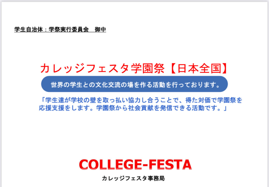 お知らせ:カレッジフェスタ事務局は、特定非営利活動法人アイ・エイチ・シーエヌと学生を応援支援を2008年~2024年8月31日まで運営しておりましたが、2024年9月から合同会社COLLEGE FESTAが、カレッジフェスタ事務局を運営することになりました。