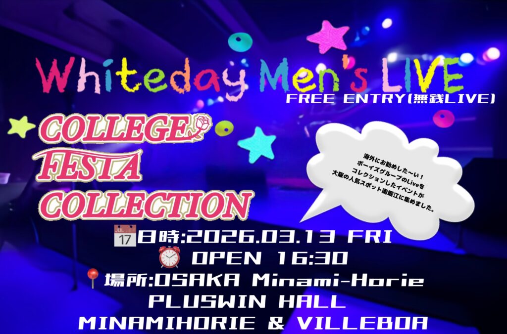 COLLEGE FESTA COLLECTION in MINAMIHORIE 2026.03.18 Whitedai Men’s Live Festivai ■出演:ELVA・Aim for One 2マンLIVE ■会場:VILLEVOA ■18:00~